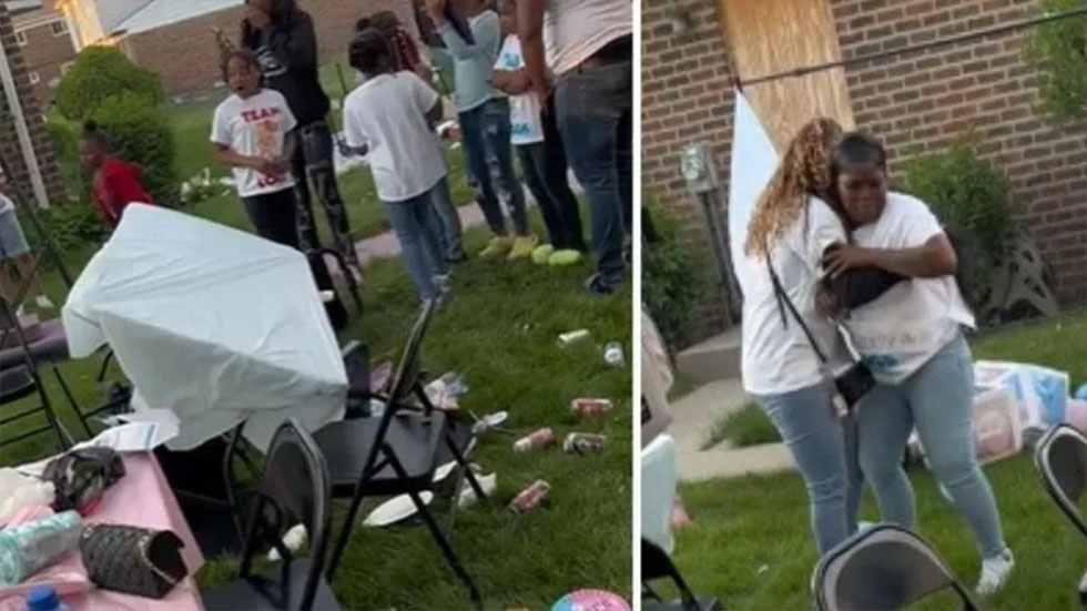 Mesas foram viradas, pratos e comida foram espalhados pela grama. Em meio ao tumulto, é possível ouvir a mãe declarando com clara perturbação: “Já temos uma menina”.